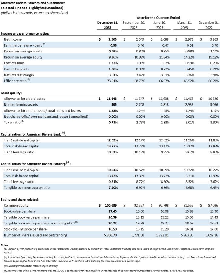 American Riviera Bancorp Announces Results for the Fourth Quarter of 2023