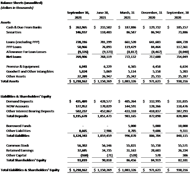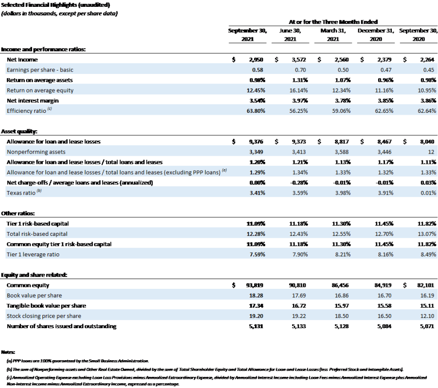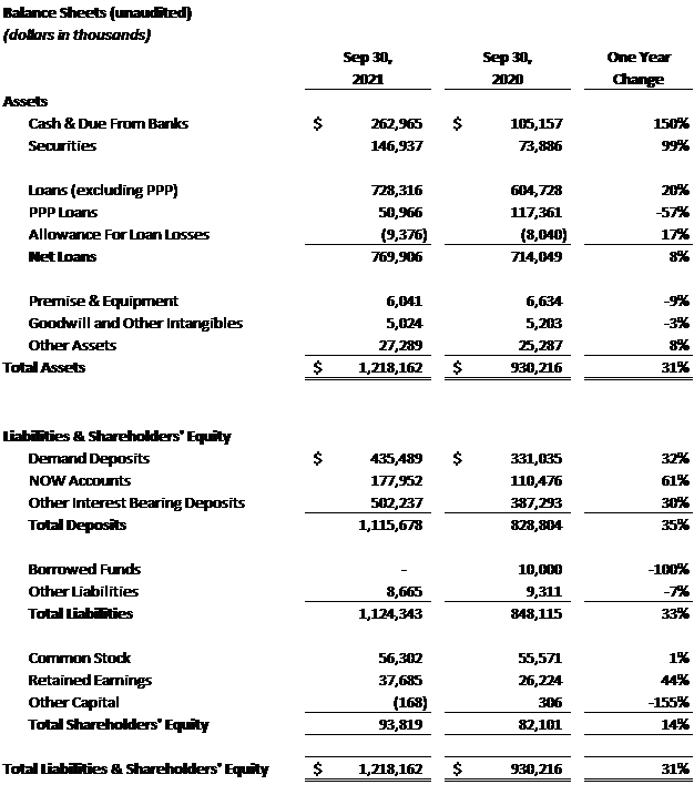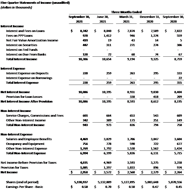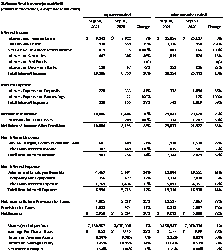 In 2021, the Bank has achieved an annualized return on average assets of 1.12% and return on average equity of 13.64%. Unaudited net income was $2,950,000 ($0.58 per share) for the third quarter ended September 30, 2021, compared to the $2,264,000 ($0.45 per share) earned in the same reporting period in the prior year.
