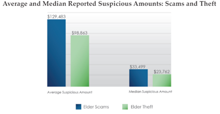 For the first time, the data showed that elder financial exploitation through scams were reported more often than through theft. FinCEN notes that 80% of reports were for elder scams, with a much higher average dollar amount at around $130,000, versus elder theft, which was under $100,000. Checks and wires were the most frequent methods of transmitting scam funds.